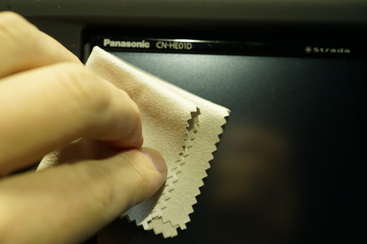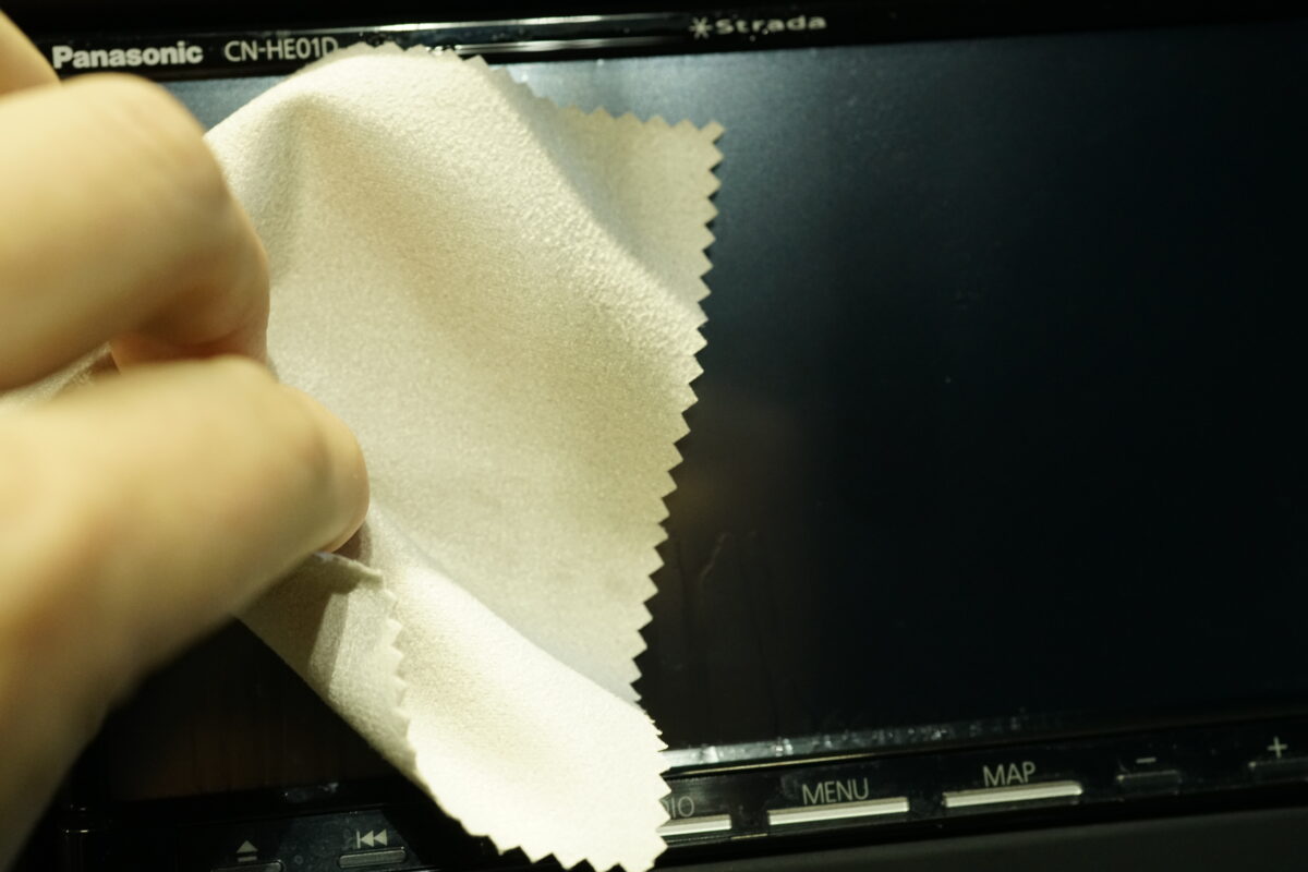 今回はカーナビに施工することにしたため、まずは液晶画面用のクリーニングクロスでしっかりと汚れを落としました。