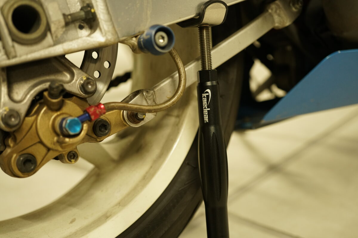センタースタンドがあれば、タイヤを空転させながらスムーズにメンテナンスできますが、愛車のGSX-R1000には装備されていないため、これまではバイクを転がしながら作業していました。