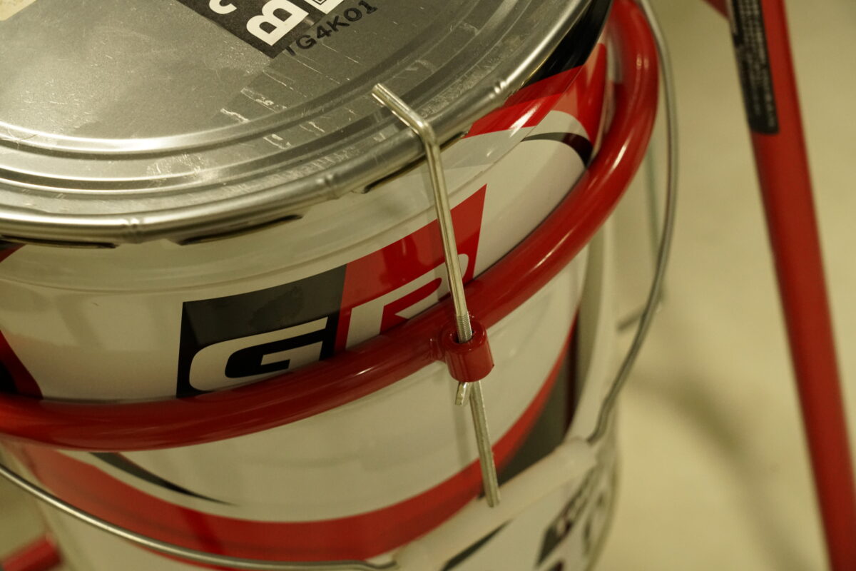 そんなときに便利なのがペール缶スタンドで、1度スタンドにセットしてしまえば、レバーを軽く操作するだけで缶をスムーズに傾けられ、オイルをジョッキへ注ぐ作業が一気にラクになります。