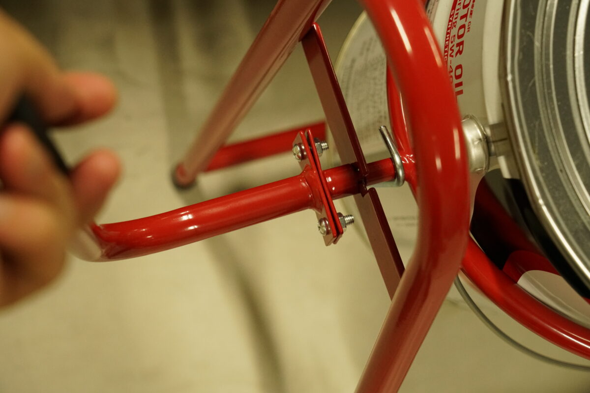 ハンドルを傾けたときにペール缶が落下しないよう、スタンドにはしっかりとした落下防止ストッパーが付いているため、安全に作業できます。