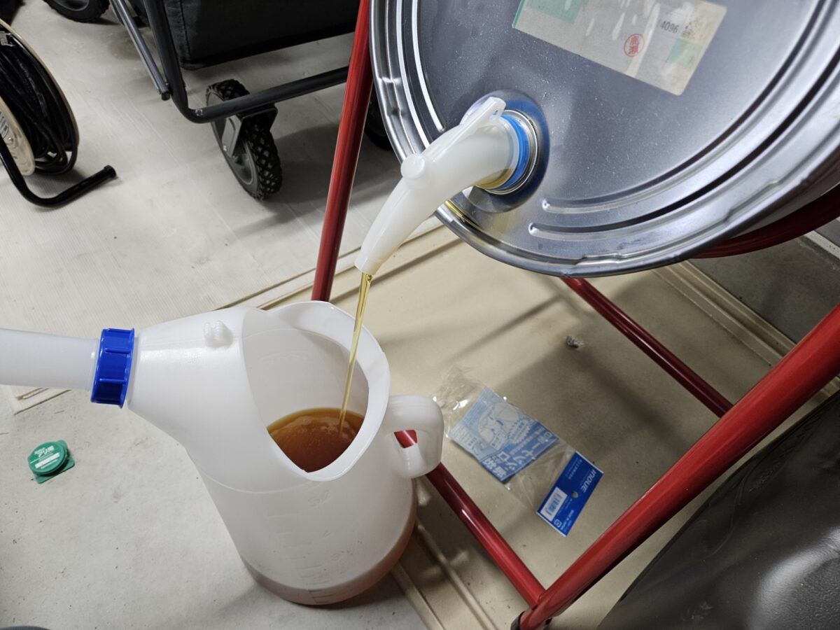 ペール缶は約20kgと重いため、手で持ちながらオイルジョッキに注ぐのはなかなか大変で、実際に注いでいる最中に少しこぼしてしまいました。