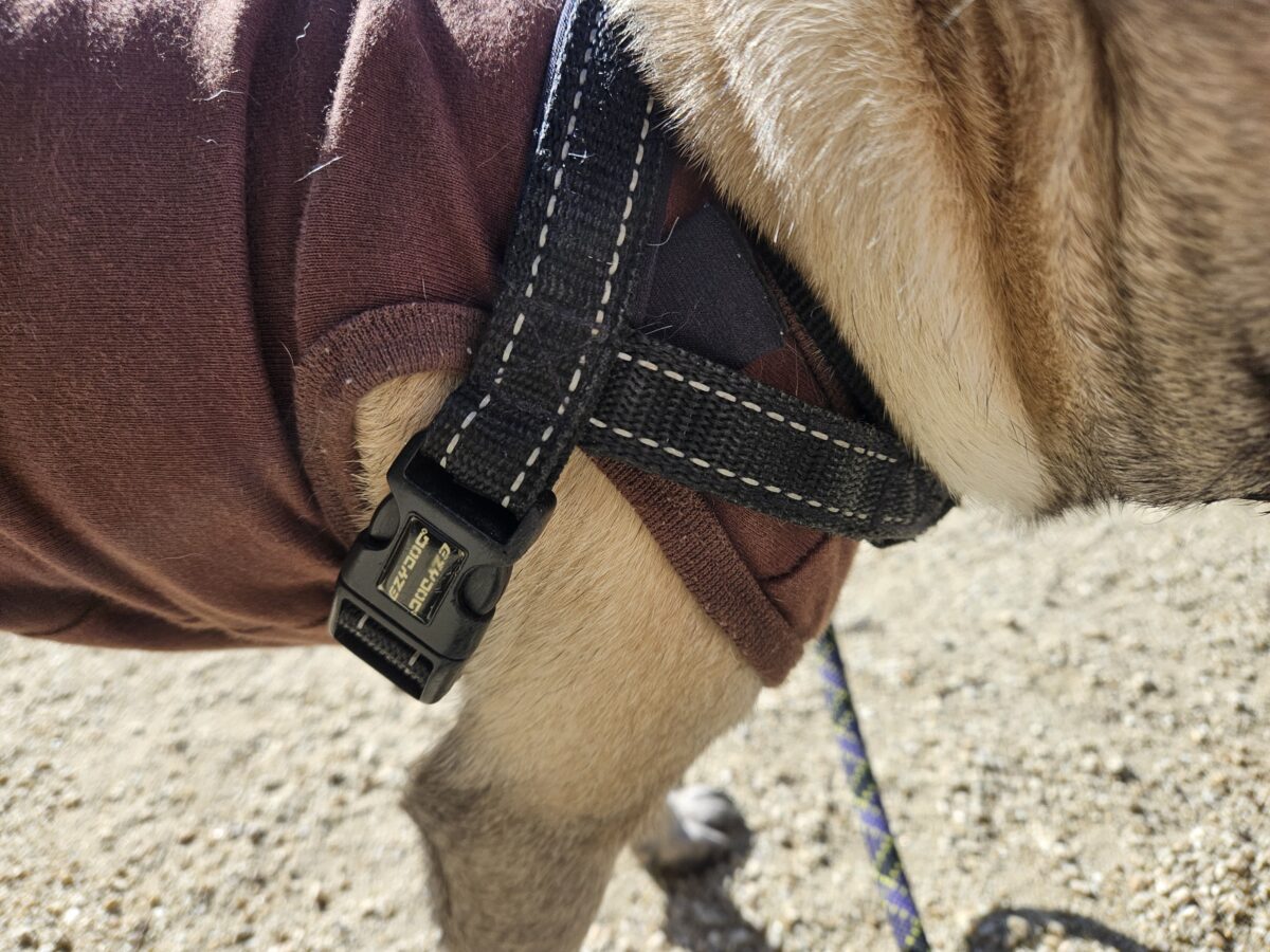 その際に使用しているのが、Ezydogのクイックハーネスで、使い始めて4年目になりますが、壊れることもなく、散歩中に外れてしまう心配もないため、安心して使い続けられています。